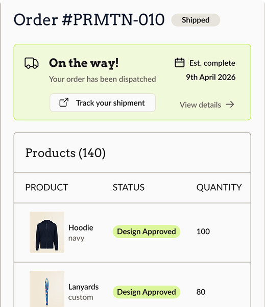 Organise merch, across teams, company wide. Manage your company merch catalogue, orders, warehouse stock and shipments.